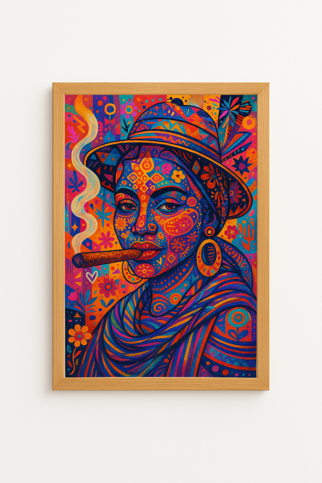 Plongez dans une ambiance puissante et colorée avec cette œuvre représentant une femme malgache au regard assuré, parée de motifs tribaux et fumant un cigare.
