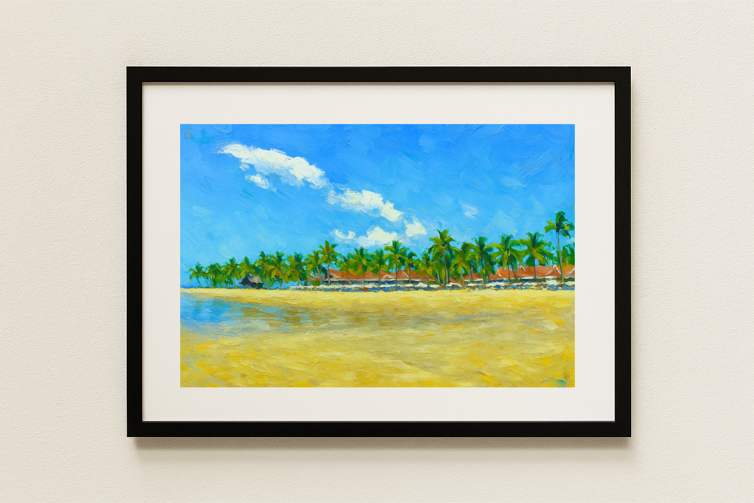 Les touches lumineuses de bleu azur, de jaune sable et de vert palmier créent un paysage éclatant, baigné d’une lumière tropicale intense.