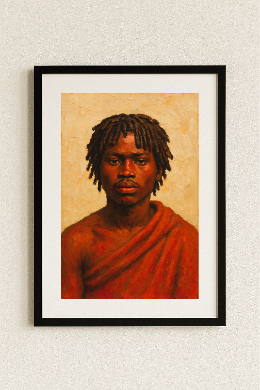 Son regard droit et ferme exprime la détermination et la sérénité d’un héritier des traditions ancestrales.