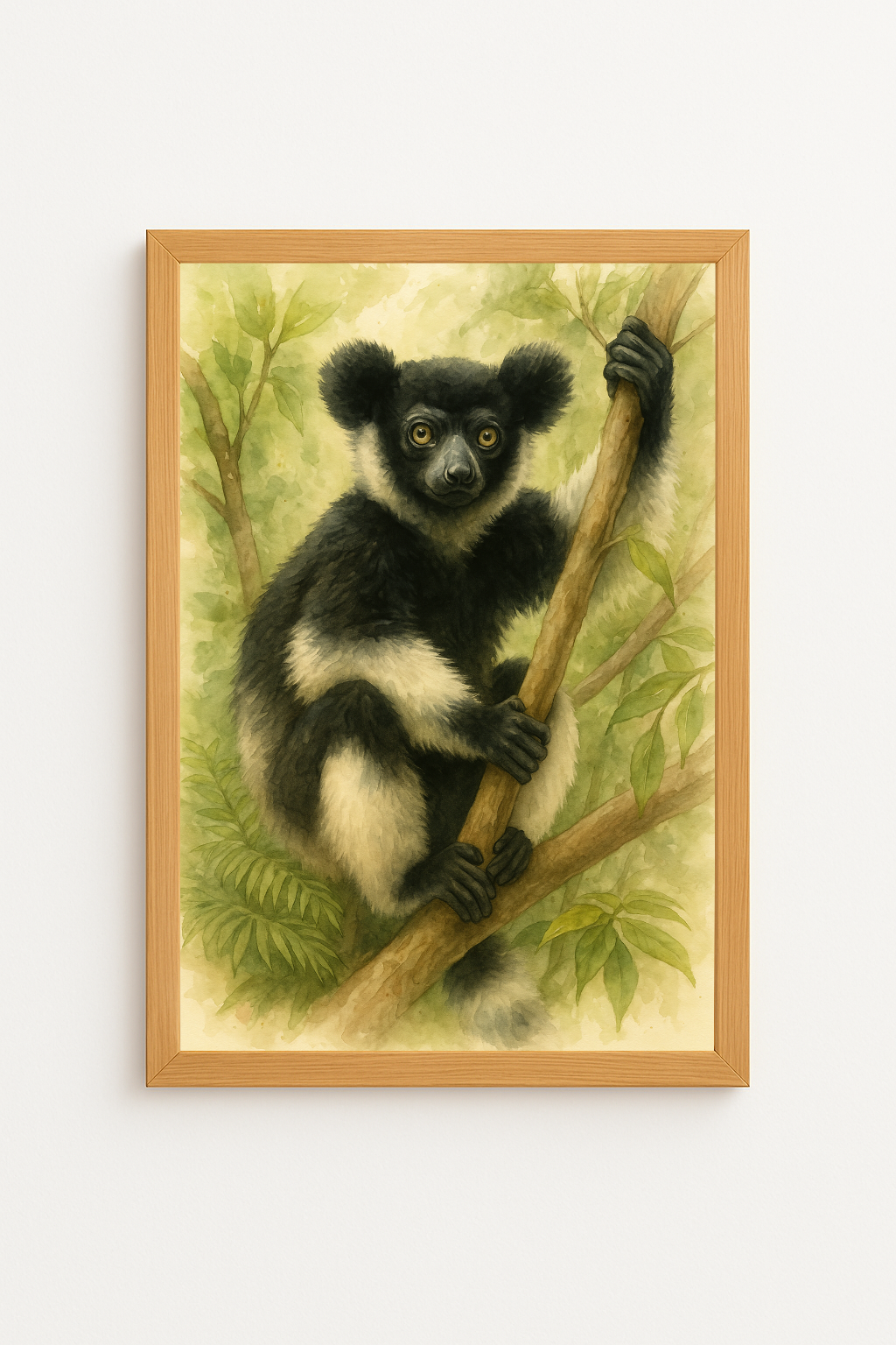 Cette œuvre est prête à imprimer en haute qualité, idéale pour des formats A4, A3 ou en grand poster décoratif.Offrez à votre espace un souffle de sagesse et de nature malgache grâce à cette illustration délicate d’un Indri indri, gardien silencieux des forêts anciennes.