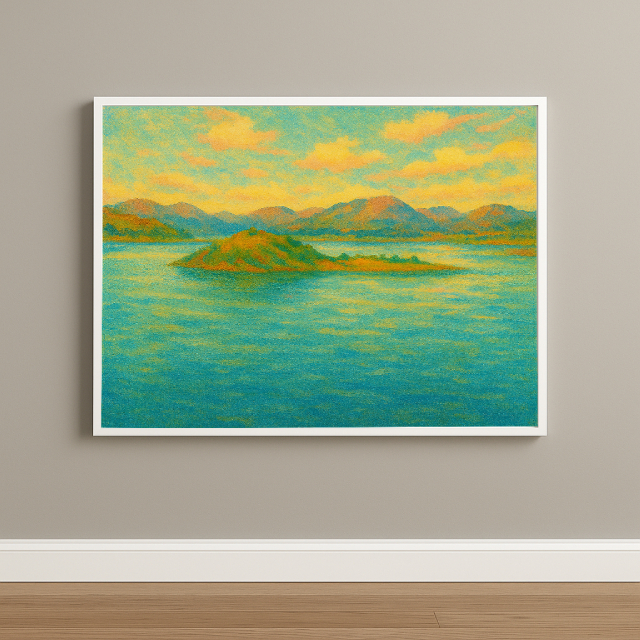 Peinture texturée – Ce style doux et vibrant accentue les reflets lumineux sur l’eau et la douceur pastel du paysage volcanique environnant, évoquant la quiétude et l’harmonie naturelle.