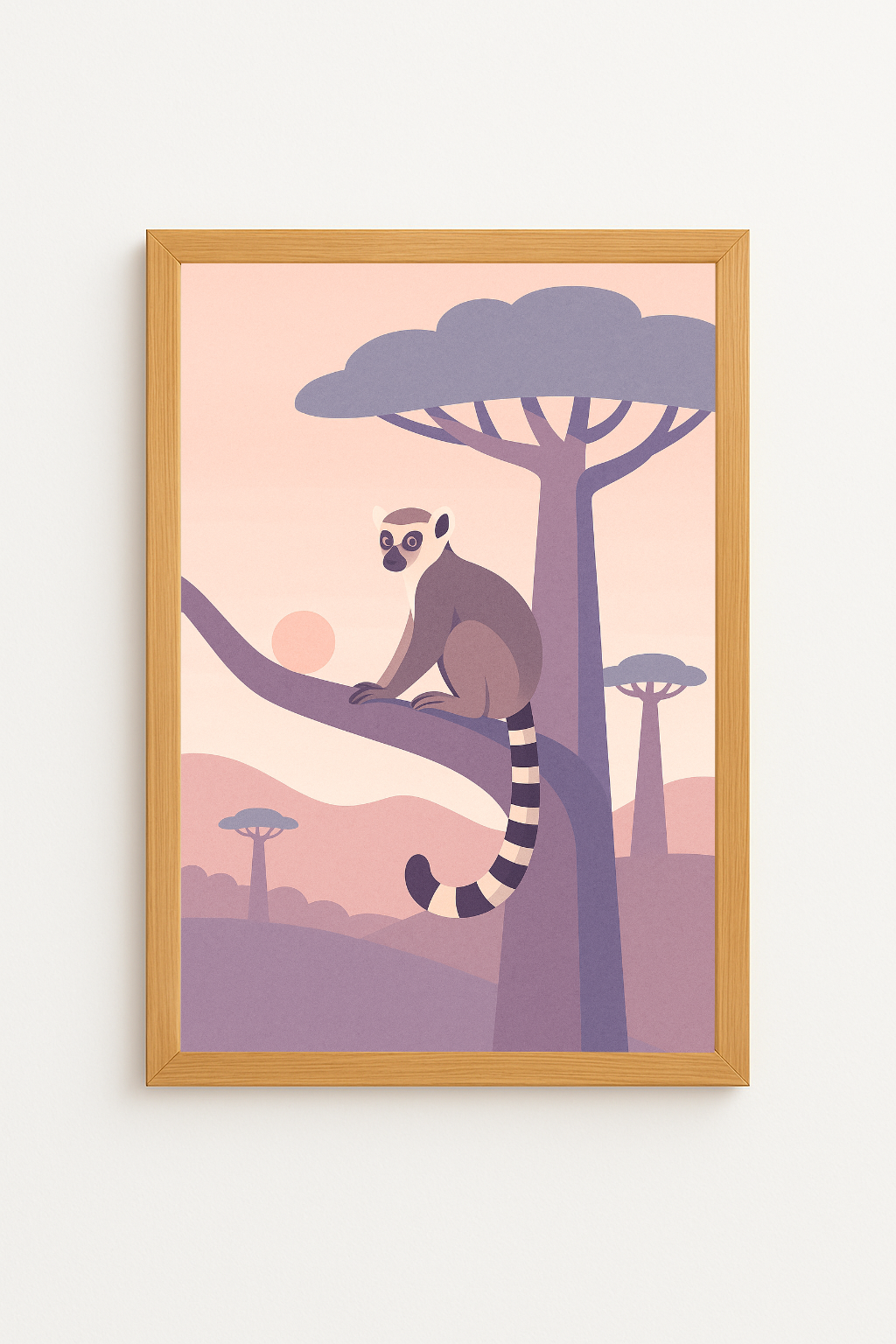 Ce style aux formes épurées et couleurs pastel renforce l’aspect paisible de la scène, tout en mettant en valeur l’esthétique graphique du lémurien et des baobabs emblématiques.