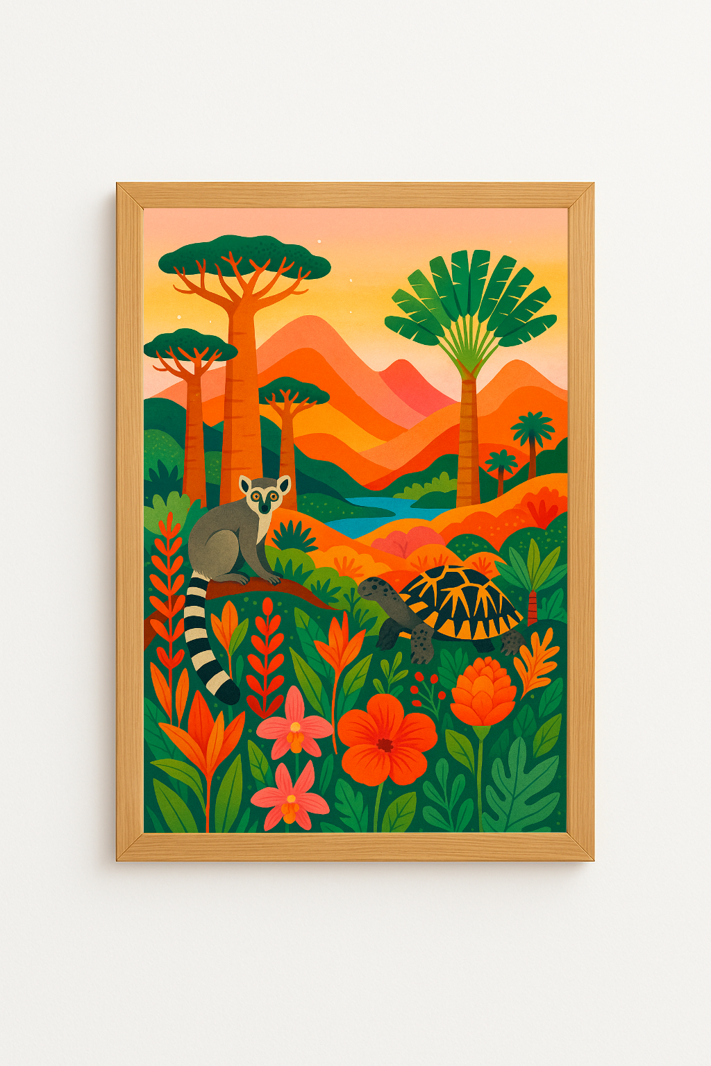 Plongez dans la magie tropicale de Madagascar avec cette scène colorée mettant en valeur un maky curieux et une tortue radiée, au cœur d’une jungle florissante et de baobabs majestueux. Son style graphique audacieux en fait une pièce vibrante, idéale pour une décoration naturelle, exotique ou moderne.