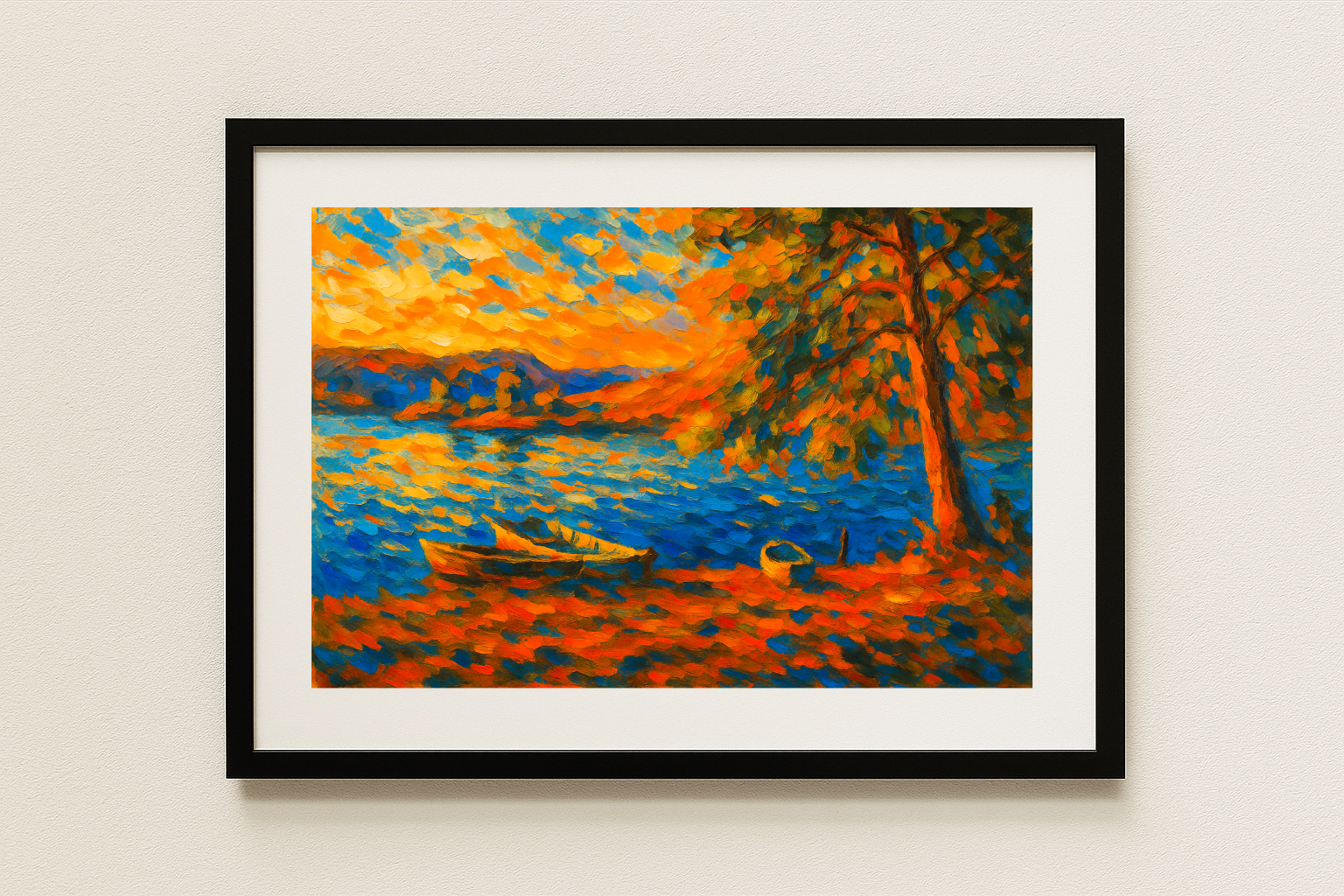 L’œuvre évoque la chaleur du crépuscule, la tranquillité des barques et la poésie du lac, où chaque élément se transforme en lumière.