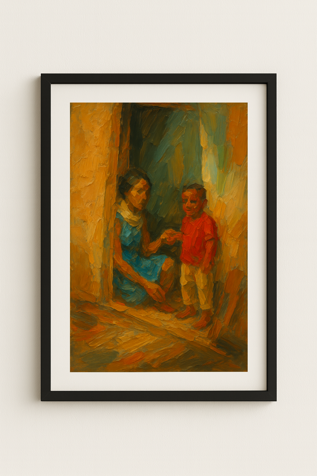 La composition évoque un moment suspendu : un échange, une leçon, une présence maternelle — fragment précieux de la vie quotidienne.