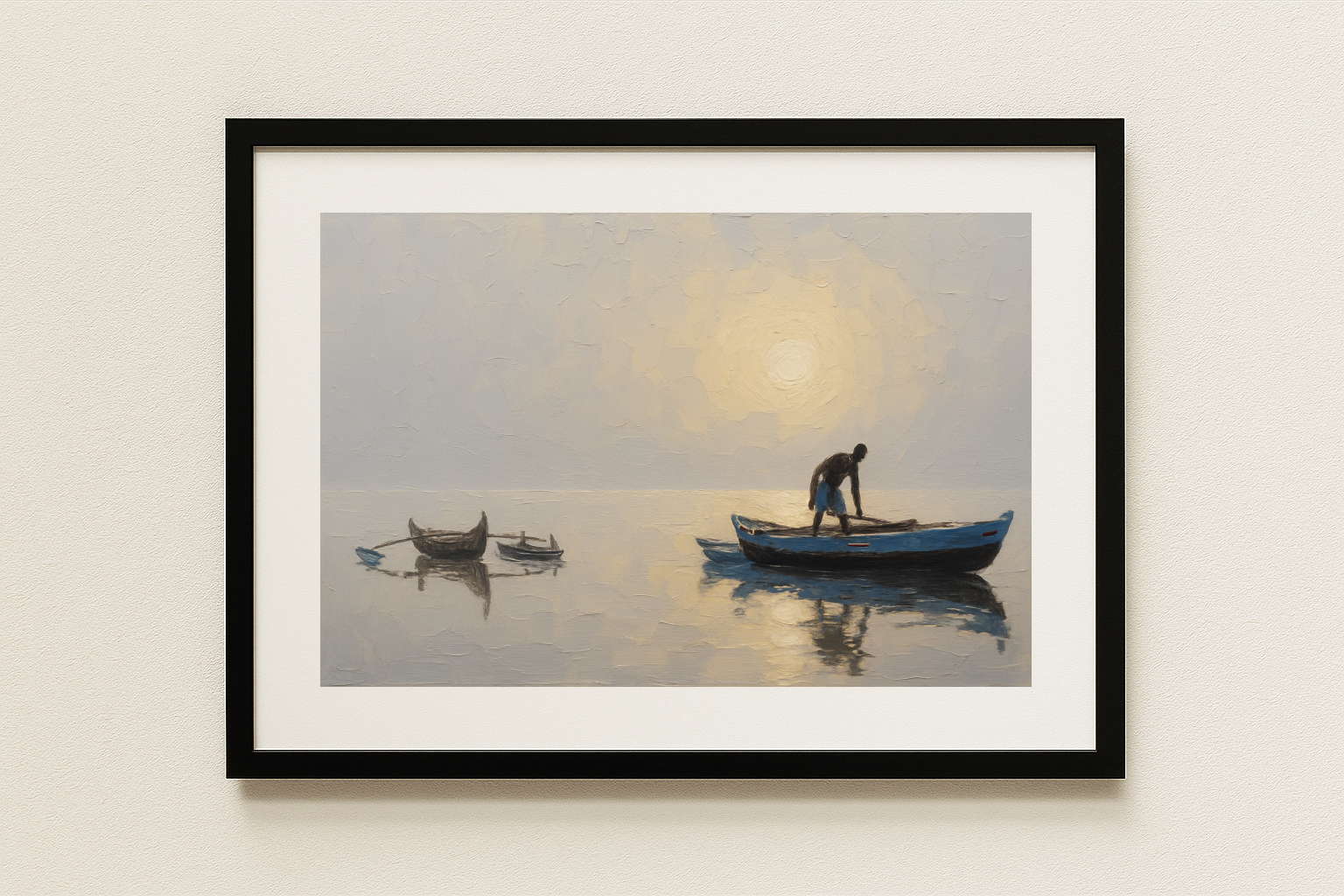 Un tableau apaisant et lumineux : Pêcheur au matin – Silence d’or célèbre la beauté des instants calmes, le travail humble des pêcheurs et la poésie d’un horizon doré qui s’éveille lentement. Une œuvre douce, méditative et profondément inspirante.