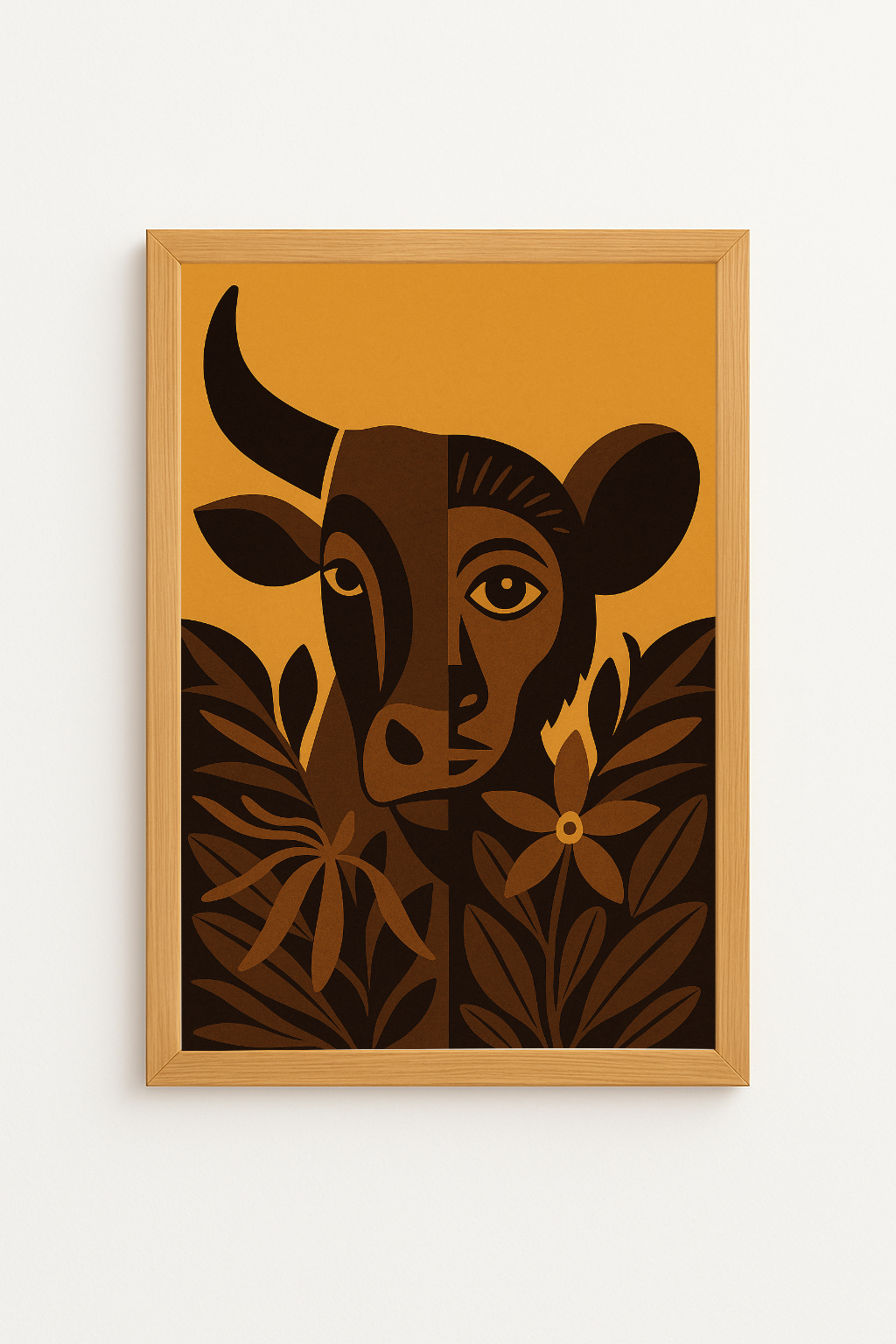 Les feuillages stylisés entourent et relient les deux figures, soulignant une coexistence harmonieuse entre les espèces, la terre et les croyances.